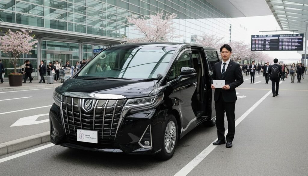 Illustration of booking luxury private airport transfers in Japan, showing comfortable vehicles and efficient service for travelers.